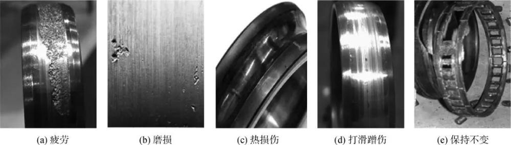 主軸軸承運(yùn)行在極端苛刻工況及復(fù)雜環(huán)境條件下,失效形式十分復(fù)雜且可能出現(xiàn)多種失效并存。主軸軸承的主要失效模式包括疲勞、磨損、熱損傷、打滑蹭傷、保持架失效等[15],如圖1所示。